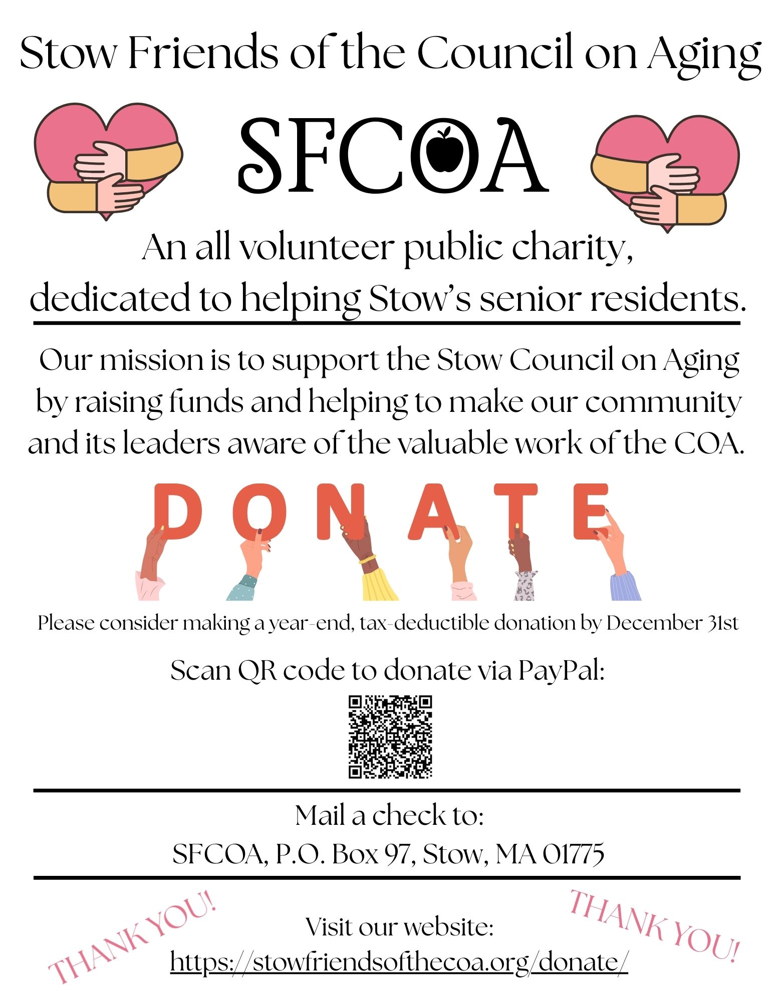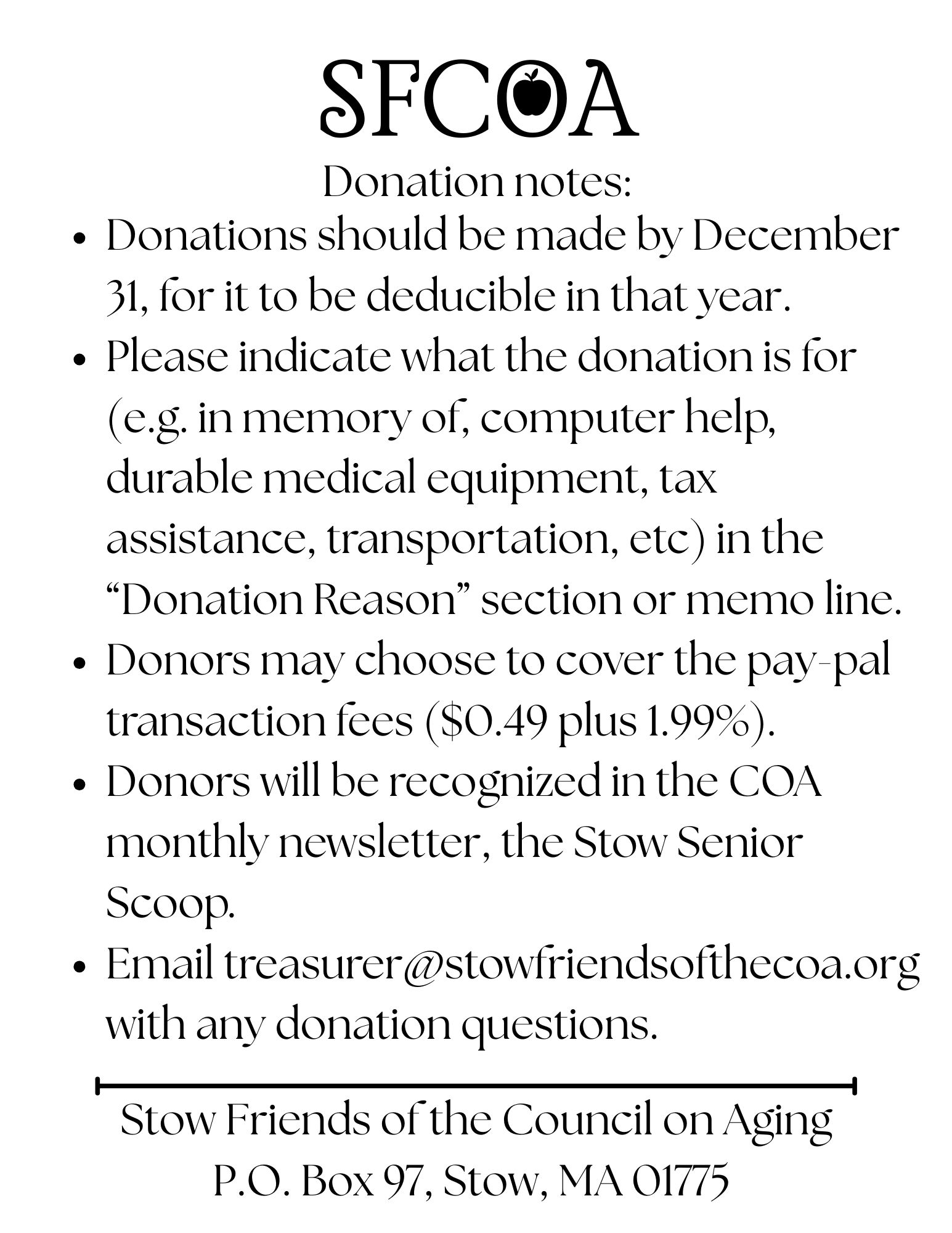Stow Friends of the Council on Aging is the main fundraising organization for the Stow Council on Aging. We are a 501 (c) (3) all volunteer public charity, dedicated to helping our senior citizens lead an active life and stay independent as long as possible.